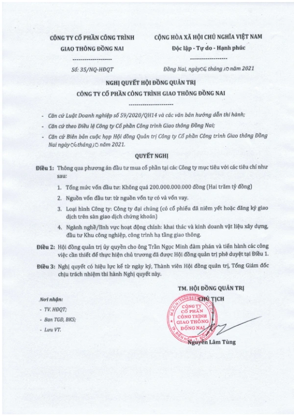 Số: 35/NQ-HĐQT vv thông qua phương án đầu tư mua cổ phiếu tại các công ty mục tiêu